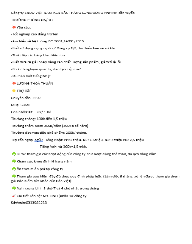 Công ty ENDO VIỆT NAM-KCN BẮC THĂNG LONG ĐÔNG ANH HN cần tuyển
